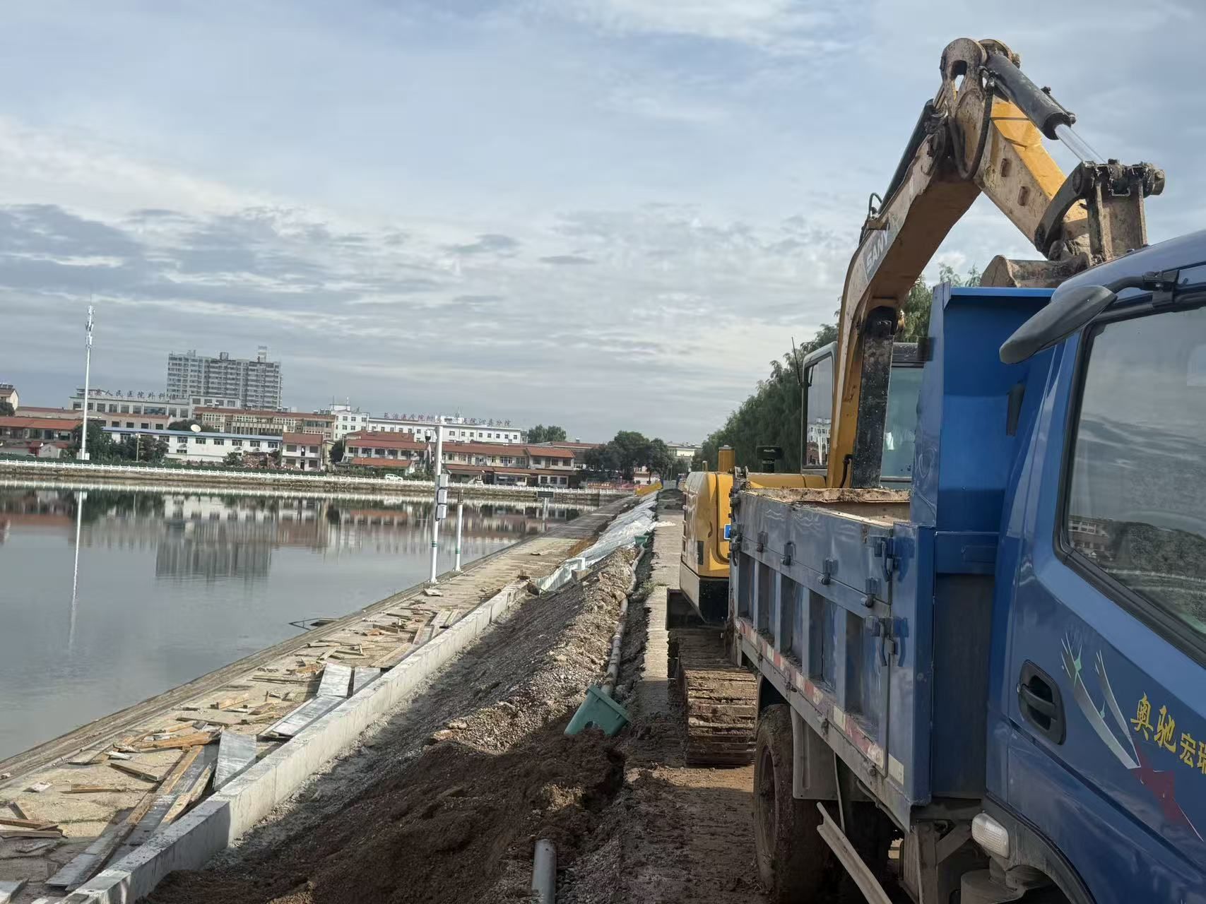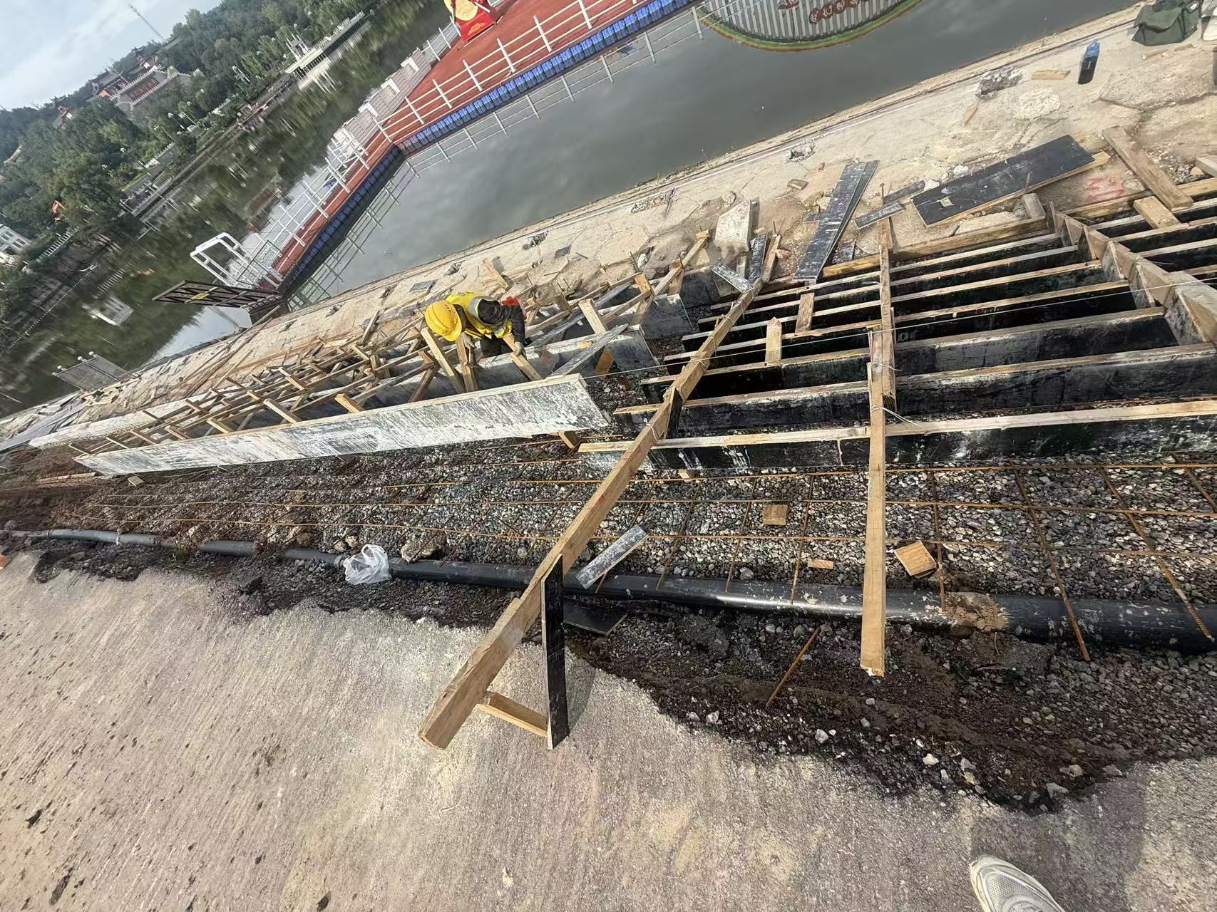 ●沁县环湖路(西湖东堤)改造项目:西湖西侧人行道坝坡台阶、花池基础混凝土浇筑施工,石材准备铺贴。