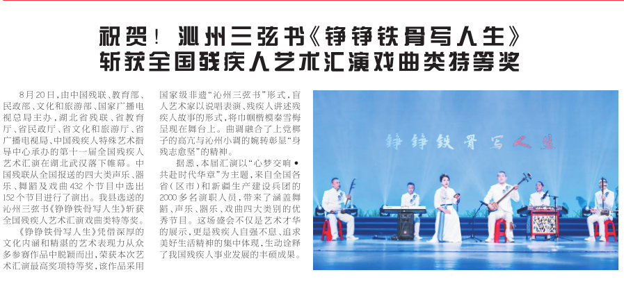 传统曲艺沁州三弦书走出三晋 身残志坚展现新时代残疾人精神。在2025年8月18日至20日于湖北省武汉市举行的第十一届全国残疾人艺术汇演中,由长治市推荐、沁县残疾人联合会带来的沁州三弦书《铮铮铁骨写人生》在现场汇演的152个节目中,以深沉厚重的艺术底蕴和细腻传神的舞台表现打动全场,最终从众多优秀剧目中脱颖而出,荣获戏曲类特等奖。