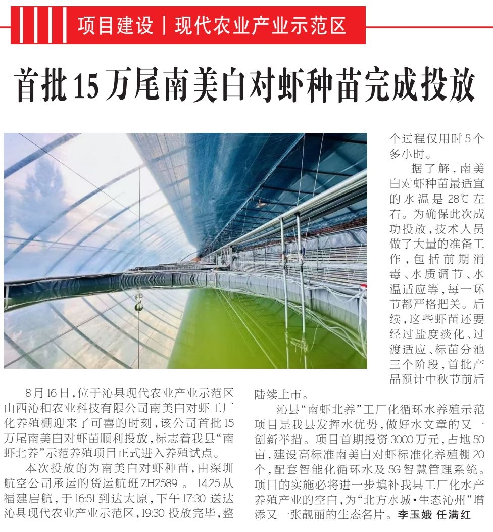 因地制宜招引项目结硕果,工厂化水产养殖开先河。沁县现代农业产业示范区15万尾南美白对虾种苗高效投放,标志项目正式进入养殖试点。依托优质水优势水资源,我县正以智慧养殖技术突破地理局限,将水优势转化为产业优势。深耕水产业,延展链条发展,探索北方县域水产养殖转型升级新路径,推动生态保护与经济发展互促共赢,让沁州水韵焕发更强劲动能。