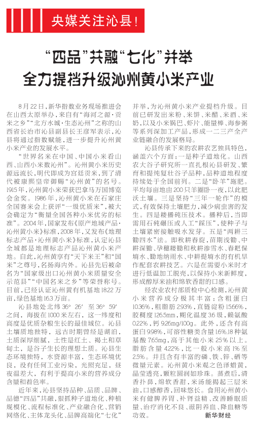 “四品七化”塑品牌,央媒助力沁州黄小米香飘新征程。近日,新华指数业务现场推进会探访我县如何以“四品”共融、“七化”并举战略推动特优农业提质升级——我县坚守品种、品质、品牌、品德融合发展,全力推进“七大”举措,多管齐下让传统的“沁州黄”焕发全新活力。沁县正以指数赋能和全产业链思维,借助中央媒体的强大传播力,擦亮“国米”金字招牌,走出了一条特色农业品牌化、高端化的振兴新路。