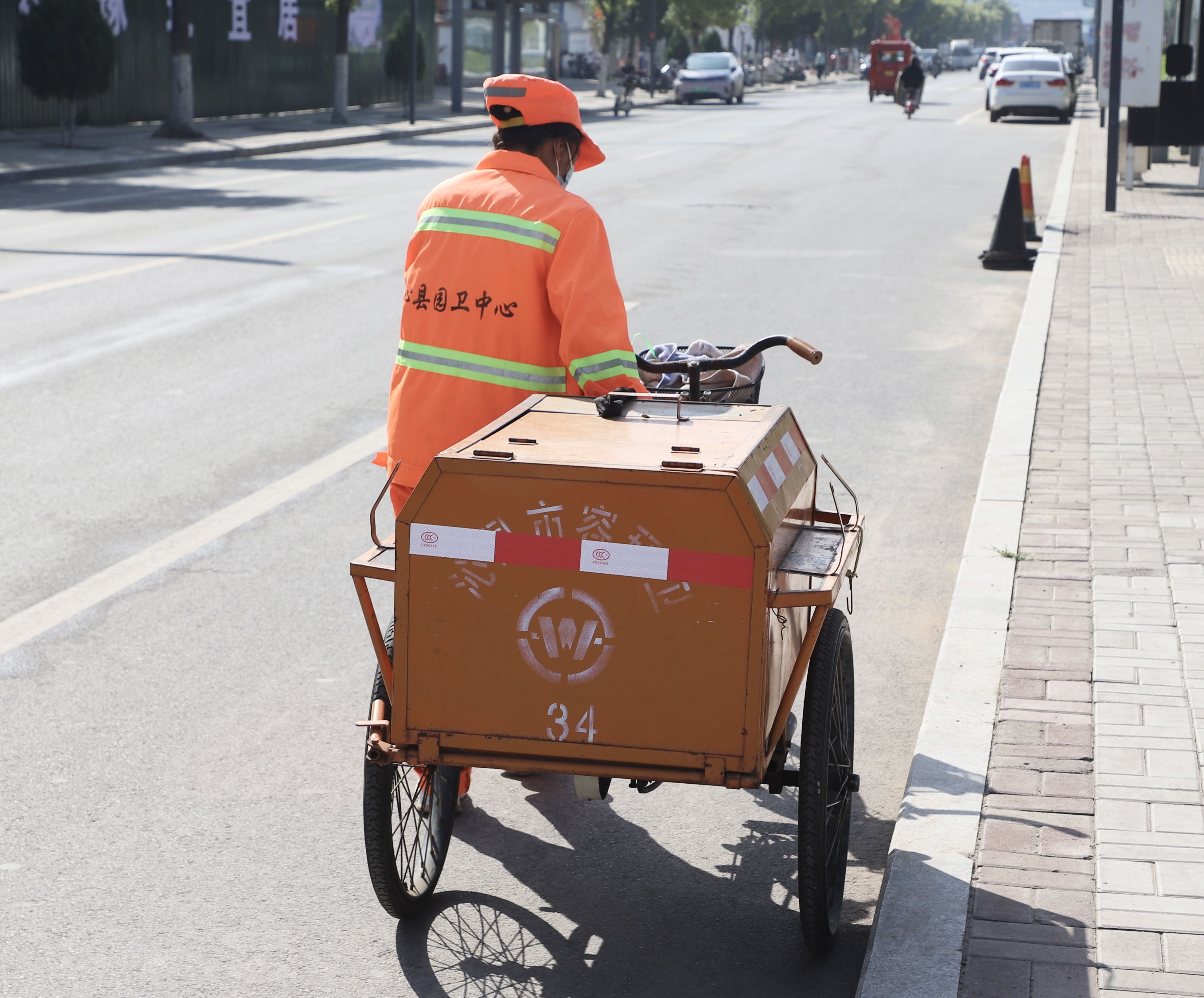 凌晨四点,天还未亮,街道上冷清寂静,在告别了昨日的喧闹后留下一片狼藉,在不远处的马路上,记者看到,51岁的环卫工人刘夏莲早已穿上橙色工作服,推着清扫车出现在沁阳西街,她的任务就是在天亮之前将自己负责区域的卫生全部清扫一遍。“我每天3点半起床,4点就来到马路上打扫,每天把马路打扫的干干净净,大家走着舒服,我心里也特别开心”。刘夏莲的话虽朴实,却道出了所有环卫工人的心声。她手中的扫帚柄被磨得光滑发亮,每一次划过路面,都发出“沙沙”的声响。在街边的垃圾桶旁,刘夏莲重复着弯腰、清扫、装运的动作,略显佝偻的身影在烈日下格外显眼。