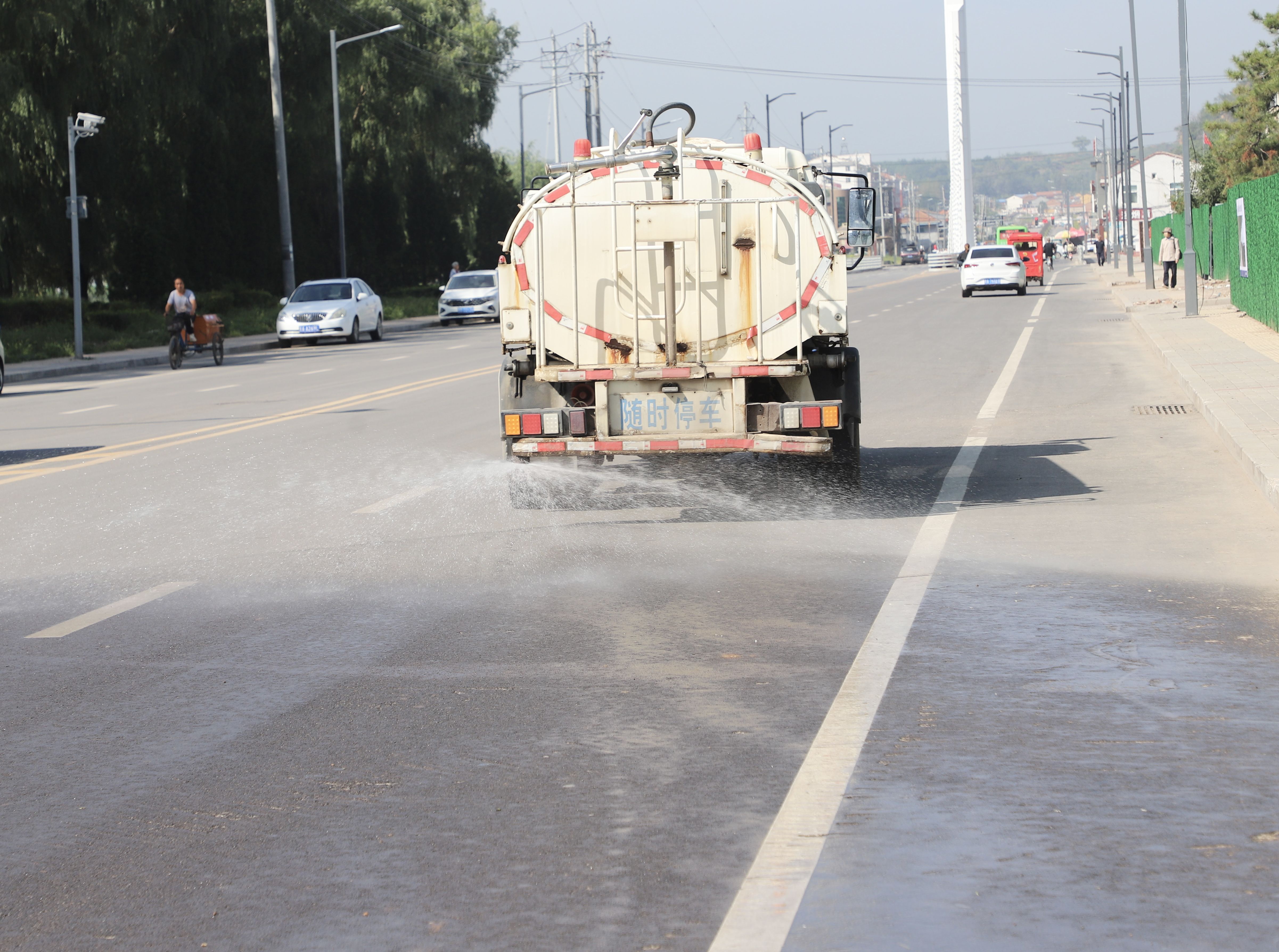 为给市民创造一个清洁、舒适的出行环境,县园林绿化和市容环境卫生服务中心每天安排16台垃圾清运车、洒水车、雾炮车齐上阵,对县城内的主要道路开展“冲、扫、吸、洒、运”一体化作业。高压冲洗车针对路两侧、人行道交界处的污垢进行“边角剥离”,紧接着洗扫车紧密配合,将污水积尘一并收集,而雾炮车则向高空浮尘发起“攻势”,喷出的水雾有效抑制了扬尘飞絮。经过立体作业,主干道真正实现了“路见本色”,路面湿润,扬尘及飞絮污染得到了有力控制。