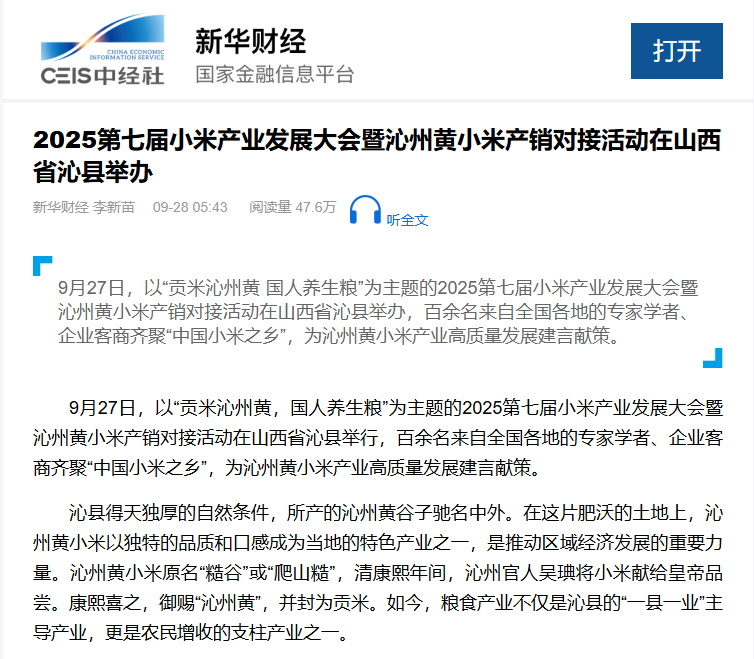活动期间,专家学者深入沁州黄小米基地观摩,参加开镰仪式。人民网发布《谷穗满仓 沁州黄小米开镰》,中国晨报刊发《沁州黄小米:金秋之约,产业新章》专题报道,既展现了沁州黄小米的种植根基,也呼应了大会“产销对接”的核心目标,让读者直观感受到从“一粒种子”到“一个产业”的完整链路。