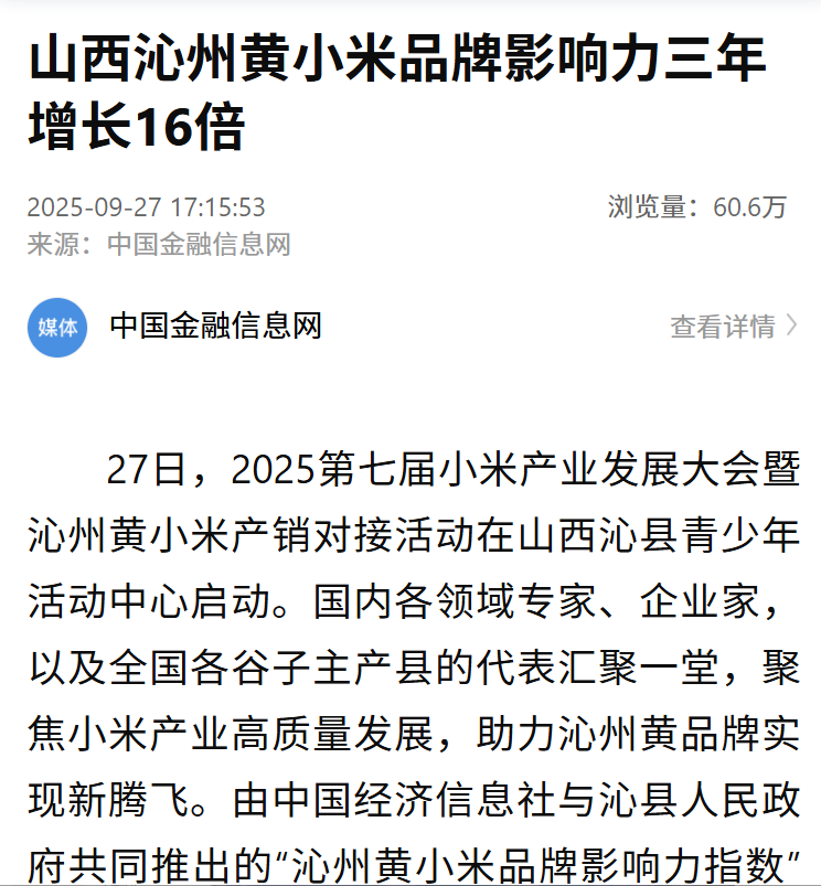 在学术交流与品牌探讨环节,媒体团持续深耕内容,让“科技赋能”与“品牌升级”成为传播关键词。当国家谷子高粱产业技术体系专家登台,分享小米产业科研成果与未来发展路径时;“小产业大品牌”圆桌交流会上,国内小米产业企业家与品牌专家围绕企业发展规划、品牌塑造路径展开热烈讨论。人民网同步以“专家学者齐聚沁县 共话小米产业高质量发展”为题进行报道。中国金融信息网适时发布“沁州黄小米品牌影响力三年增长16倍”的重磅数据,用直观数字印证品牌建设的显著成果,清晰呈现出沁县小米产业“以科技为支撑、以品牌为抓手”的发展逻辑,为企业吸引投资、拓展合作提供有力背书。
