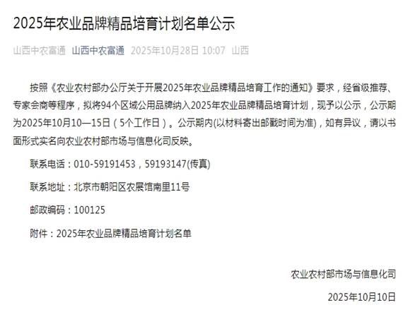 10月10日,农业农村部市场与信息化司公示2025年农业品牌精品培育计划名单,沁县区域公用品牌“沁州黄小米”成功入选,标志着这一承载千年农耕文明的“金色名片”正式迈入国家级精品品牌培育序列。