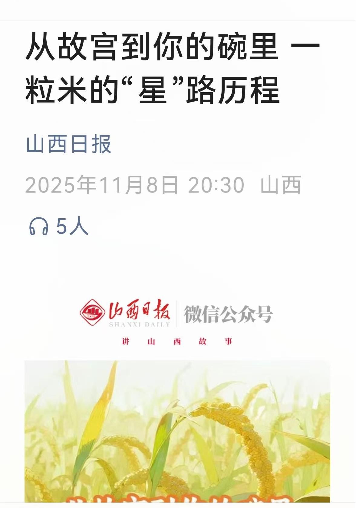 山西日报微信公众号发布《从故宫到你的碗里 一粒米的“星”路历程》,图文并茂诠释了沁州黄穿越三千年的深厚历史文化底蕴。