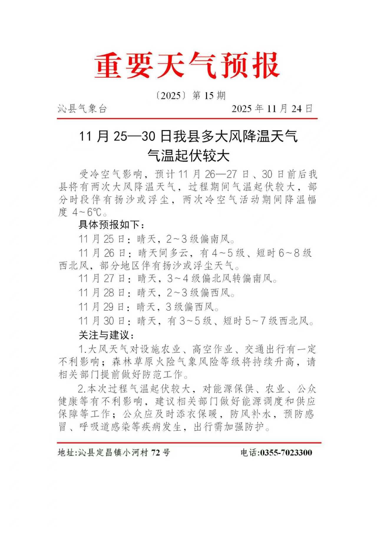【沁县气象台】[沁县环境监测站]今天夜间到明天白天:晴天,2-3级偏西风,最低气温:-6℃,最高气温:10℃。明天夜间到后天白天:晴天间多云,2-3级偏西风转3-5级西北风,最低气温:-4℃,最高气温:10℃。11月23日沁县主城区环境空气质量AQI指数:78;空气质量级别:2级,良;首要污染物:PM10。(2025年11月24日17时发布)